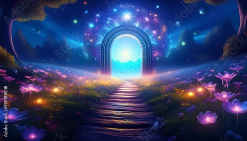 The watermark will not be included on Wall mural.: Ethereal doorway of light in a mystical nighttime meadow bioluminescent flowers and floating spirit