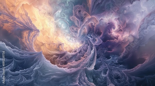 The watermark will not be included on Wall mural.: Ethereal fractal landscape with swirling textures and intricate patterns mesmerizing blend of pastel