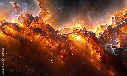 Wall mural : Ethereal nebula in space with fiery orange and gold hues illuminating a dark cosmic background