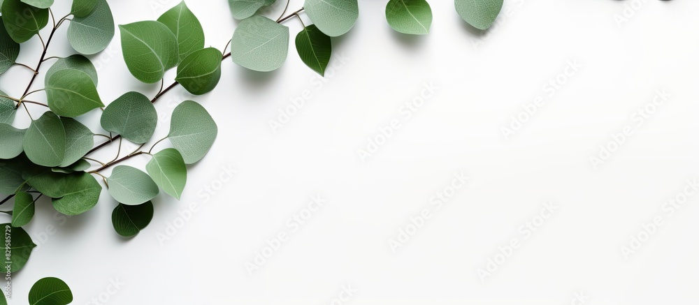 Wall mural eucalyptus branches and leaves formed into a wreath frame set against a white background for a lay f - Wall murals Wall mural eucalyptus branches and leaves formed into a wreath frame set against a white background for a lay f - Wall murals
