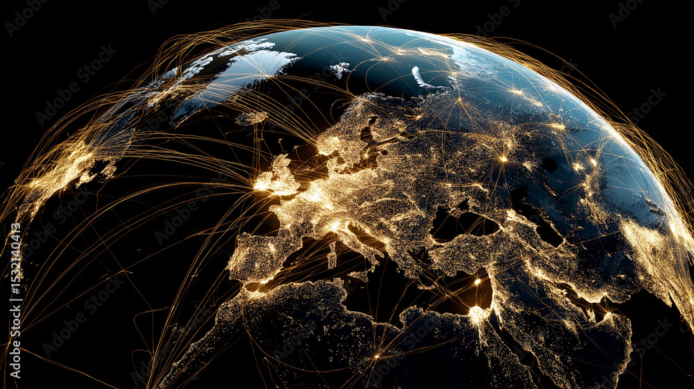 Europe-focused digital earth view with glowing connection lines symbolizing global data exchange - Wall mural