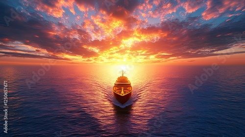 Wall mural : Evening ocean ship in the sea at sunset, majestic yacht sailing towards vibrant sunset over calm oce
