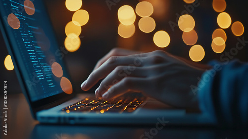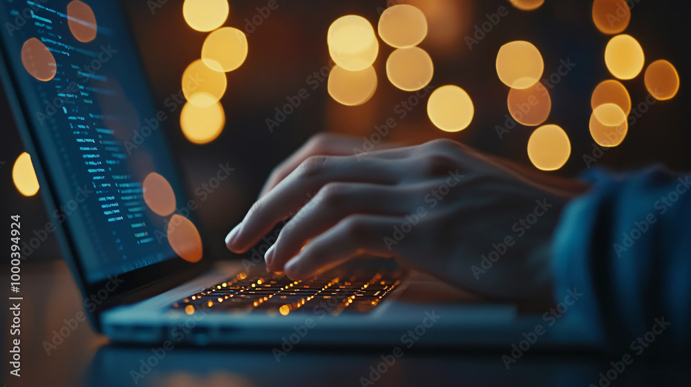 Wall mural evening scene of a software developer coding on a computer with bokeh lights in the background