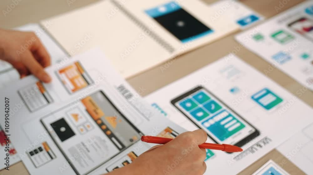 The watermark will not be included on Wall mural.: Excellent startup company employee presenting user interface prototype for mobile application to sma