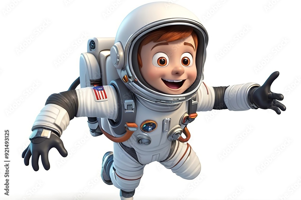 Wall mural excited astronaut with a space helmet and a jetpack, ready for launch in 3d design on a white backgr