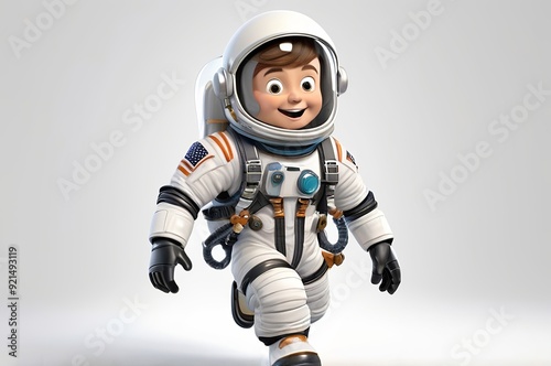 The watermark will not be included on Wall mural.: Excited astronaut with a space helmet and a jetpack, ready for launch in 3d design on a white backgr