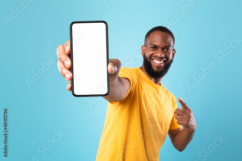 Wall mural : Excited black guy pointing at cellphone with empty screen on blue background, mockup for website or