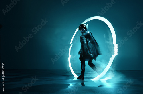 Wall mural exiting the void. a futuristic space astronaut exiting a glowing loop through time. conceptual 3d il