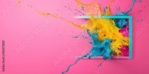 Wall mural experience a dynamic paint splash captured within a colorful frame set against a pink background - Wall murals Wall mural experience a dynamic paint splash captured within a colorful frame set against a pink background - Wall murals