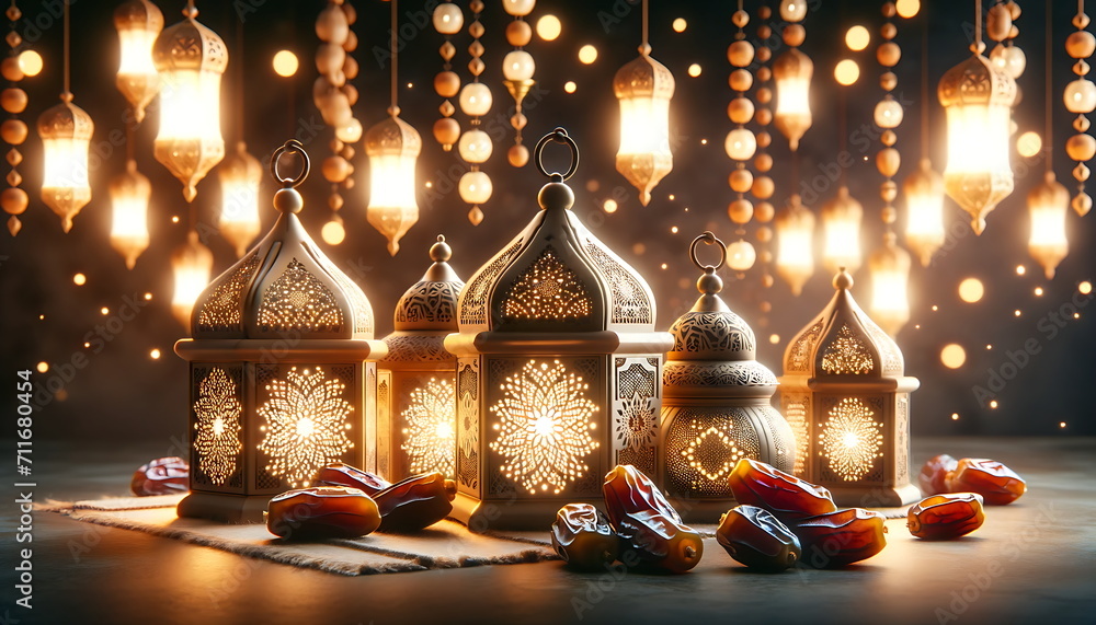 The watermark will not be included on Wall mural.: Experience the eid mubarak radiance with this ramadan lantern glow background with dates palm fruits