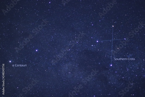 Wall mural explained astronomy - alpha centauri on the left, southern cross on the right with dark nebula coal  - Wall murals Wall mural explained astronomy - alpha centauri on the left, southern cross on the right with dark nebula coal - Wall murals