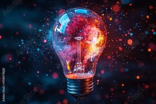 Wall mural : Exploding lightbulb with vibrant, colorful nebula inside, sparks and bokeh effect -