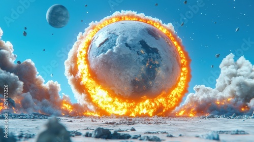 Wall mural : Exploding planet with fiery ring in a cosmic scene -