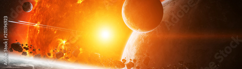 Wall mural exploding sun in space close to planet 3d rendering elements of this image furnished by nasa