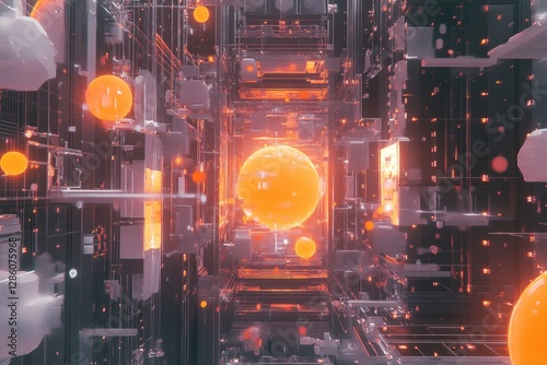 The watermark will not be included on Wall mural.: Exploring a futuristic digital landscape filled with glowing orbs and intricate patterns at the inte