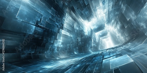 The watermark will not be included on Wall mural.: Exploring a futuristic digital tunnel with striking geometric patterns and glowing light at the end