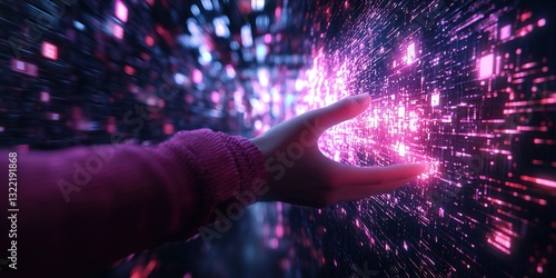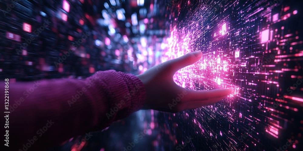 The watermark will not be included on Wall mural.: Exploring a vibrant digital landscape with a reaching hand and colorful particles in motion
