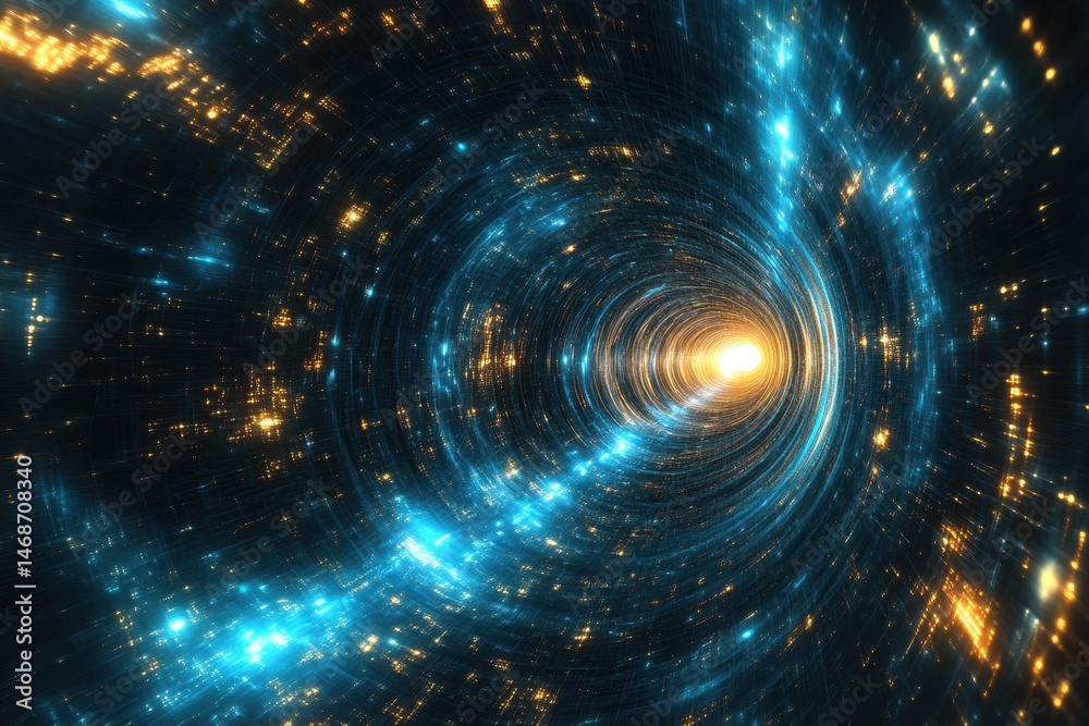 Wall mural exploring a vibrant hyperspace fractal tunnel with swirling blue lights and glowing particles, hyper - Wall murals Wall mural exploring a vibrant hyperspace fractal tunnel with swirling blue lights and glowing particles, hyper - Wall murals
