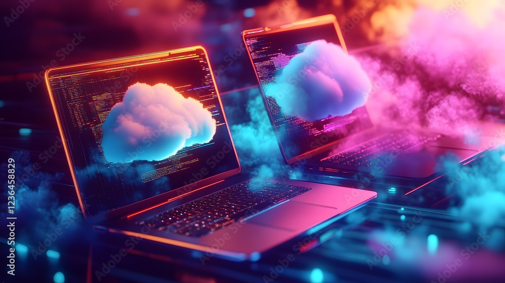 Wall mural : Exploring cloud computing a modern digital landscape with laptops and cloud icons