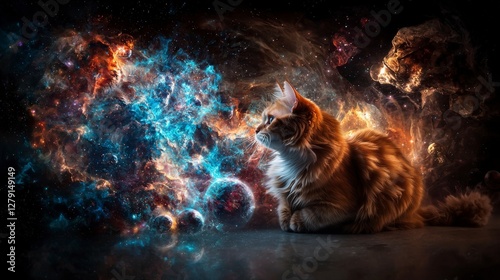 Wall mural exploring existence cosmic adventures of a cat designer in a mystical digital space environment - Wall murals Wall mural exploring existence cosmic adventures of a cat designer in a mystical digital space environment - Wall murals