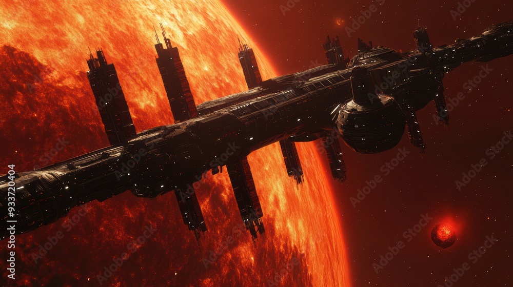 The watermark will not be included on Wall mural.: Exploring the cosmos: space station orbiting a distant red dwarf star