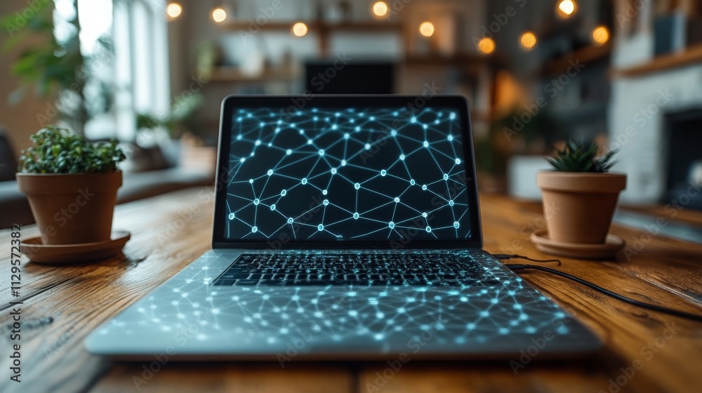 The watermark will not be included on Wall mural.: Exploring virtual networking concepts on a laptop in a cozy home setting during the day