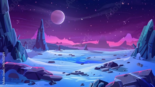 The watermark will not be included on Wall mural.: Extraterrestrial alien planet landscape with rocks, frozen pond, and glowing stars under night sky -
