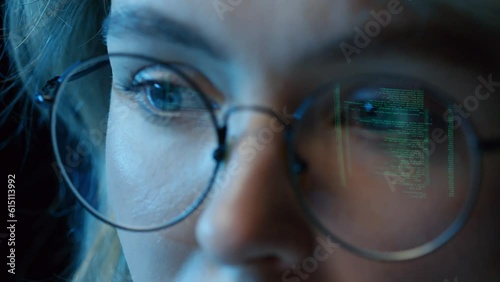Wall mural : Extreme close up of woman sitting at desk coding in computer program wearing glasses with reflection
