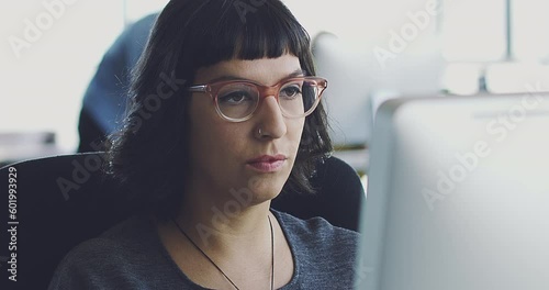 Wall mural : Face, research or programmer woman on computer for cybersecurity, coding or data analysis in office -