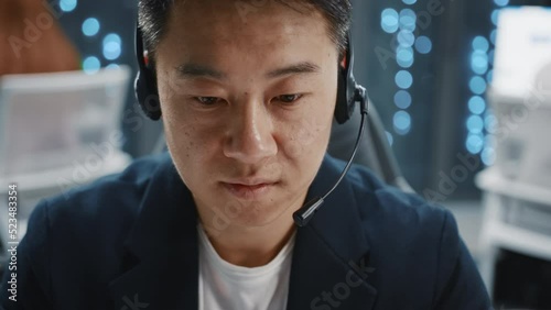 Wall mural face asian it developer administrator wearing headset speaker using laptop computer. server room tec - Wall murals Wall mural face asian it developer administrator wearing headset speaker using laptop computer. server room tec - Wall murals