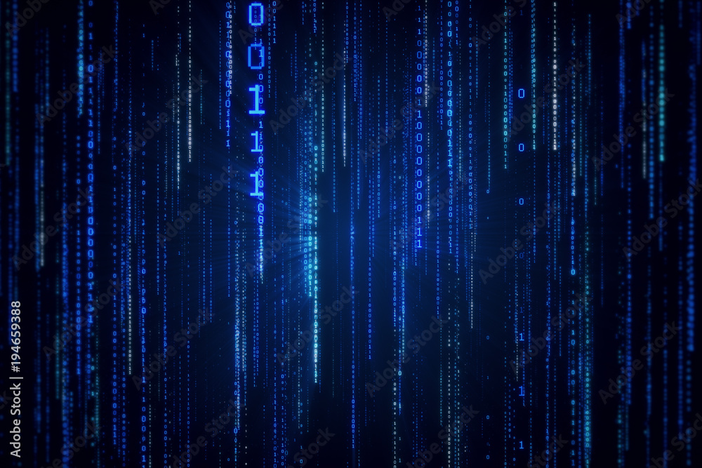 Wall mural falling binary code in the matrix style in the technological space 3d illustration