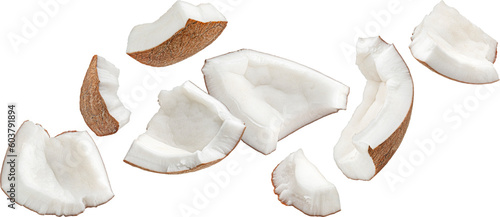 The watermark will not be included on Wall mural.: Falling coconuts pieces isolated on white background with clipping path, full depth of field