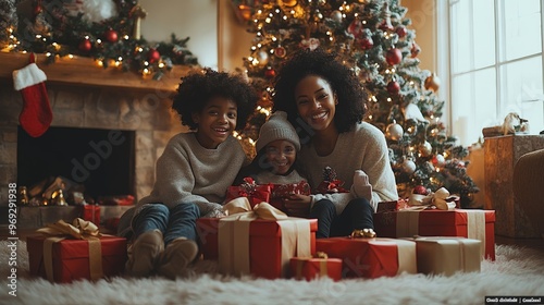 The watermark will not be included on Wall mural.: Family gathered around a brightly lit christmas tree, exchanging gifts with excitement and joy, copy