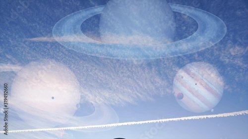 Wall mural : Fantastic animation, blue sky with puffy clouds and saturn, uranus and jupiter planet on sky -