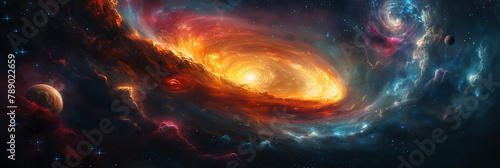 Wall mural fantastic panorama with black hole, supernova and a wormhole with planets in galaxy in space - Wall murals Wall mural fantastic panorama with black hole, supernova and a wormhole with planets in galaxy in space - Wall murals