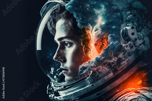 Wall mural : Fantastic portrait of a male astronaut in a modern helmet and spacesuit - generative ai