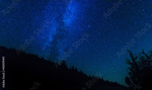 Wall mural fantastic starry night with galaxy milky way with a tourist and a tent on the mountain range in the