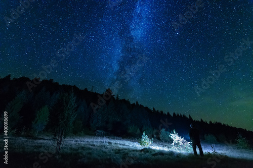 Wall mural fantastic starry night with galaxy milky way with a tourist and a tent on the mountain range in the