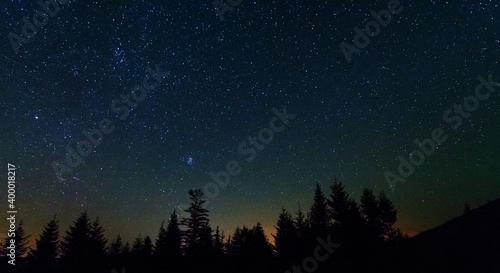 Wall mural fantastic starry night with galaxy milky way with a tourist and a tent on the mountain range in the