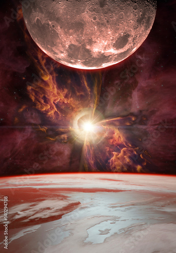 Wall mural fantasy composition of a moonrise over the planet earth. the v1331cyg star shines over the butterfly