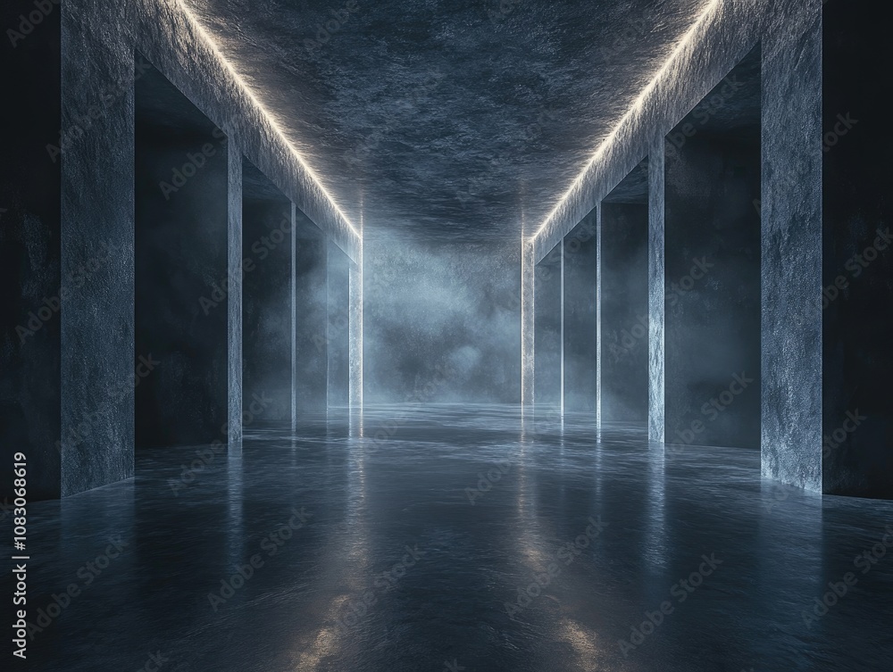 Wall mural : Fantasy dark scene with an empty interior illuminated by soft light and slate gray color palette ide