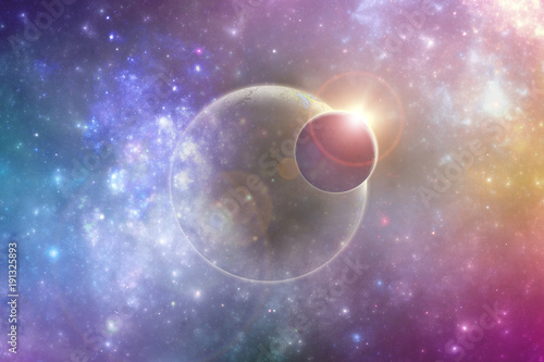 Wall mural fantasy deep space planets in colorful celestial clouds, 3d illustration