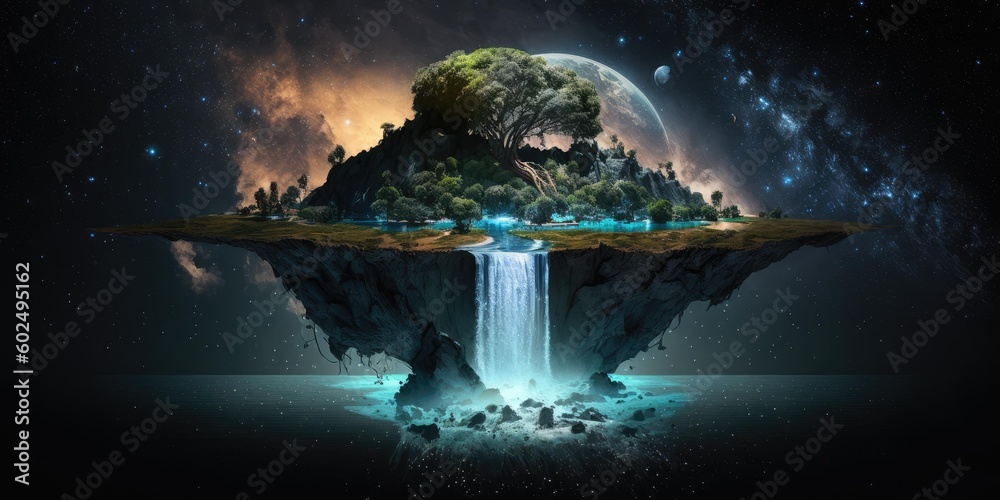 The watermark will not be included on Wall mural.: Fantasy fairytale sphere island floating in universe of night sky - superlative generative ai image -