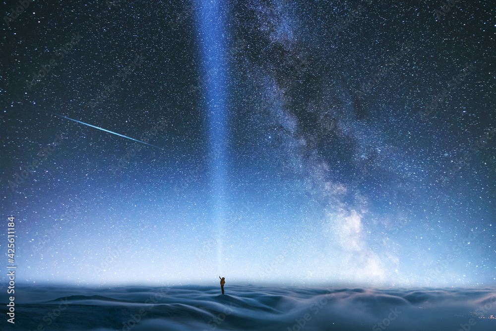 Wall mural : Fantasy night landscpe - the person with flash light stands on the hill covered long exposhur clouds -