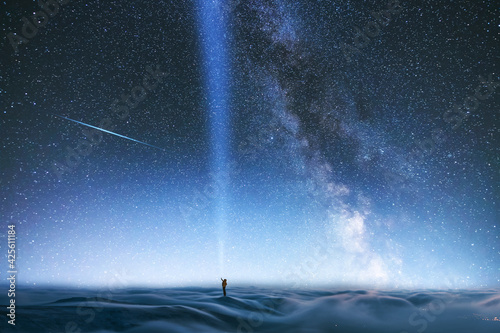 Wall mural fantasy night landscpe. the person with flash light stands on the hill covered long exposhur clouds. - Wall murals Wall mural fantasy night landscpe. the person with flash light stands on the hill covered long exposhur clouds. - Wall murals