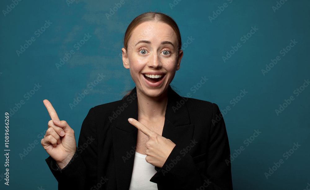 The watermark will not be included on Wall mural.: Feeling joyful and surprised, smiling with a shocked expression and pointing to the side