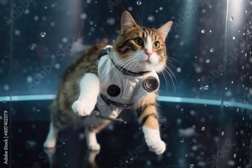 The watermark will not be included on Wall mural.: Feline astronaut floating in weightless environment, with view of starry sky visible in the backgrou