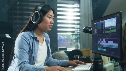 The watermark will not be included on Wall mural.: Female asian freelancer editing video for customer or travel blogger in program on computer while si
