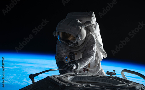 Wall mural female astronaut performing spacewalk, working on a outer part of a space craft - Wall murals Wall mural female astronaut performing spacewalk, working on a outer part of a space craft - Wall murals