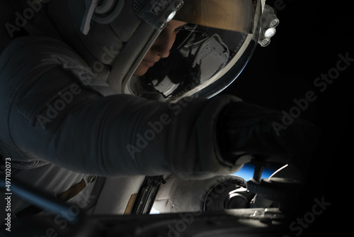 Wall mural : Female astronaut performing spacewalk, working on a outer part of a space craft